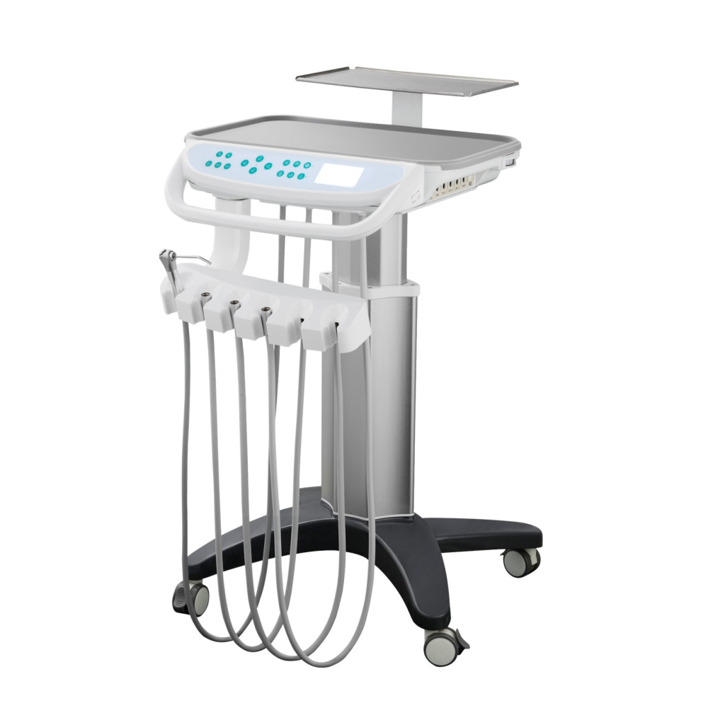 Блок врача на пантографической консоли с нижним подводом шлангов и регуляторами подачи воды и воздуха на инструменты. Имеет универсальную конструкцию с возможностью смены нижнего подвода на верхний без замены блока.