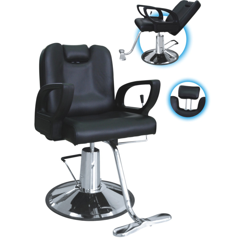 Универсальное кресло для салонов красоты. Кресло устанавливается на хромированную дисковую базу и комплектуется гидравлическим подъемником. Подлокотники пластиковые черного цвета комплектуются съемной подставкой для ног с дополнительной функцией блокировки от вращения.