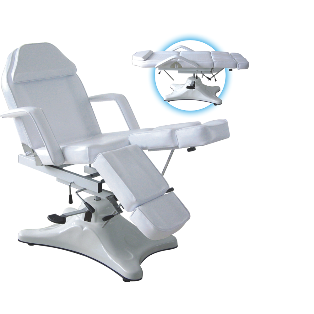 Кресло косметологическое с разрезной ножной панелью, 3-секционное. Регулировка спинной и ножной части механическая, регулировка высоты кресла - с помощью электромотора. Отверстие для лица, выдвижные подставки под пятки. База металлическая в пластиковом кожухе. Обивка - кожзаменитель.
